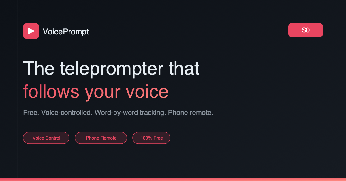 Paste your script, hit start, and speak naturally. VoicePrompt listens to your voice and scrolls word by word in real time. Control it from your phone. No foot pedals. No subscriptions. Just you.